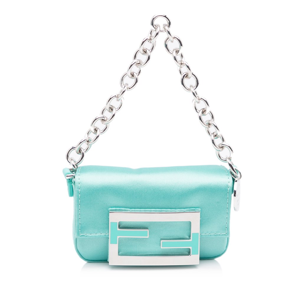 The x Tiffany Baguette features a satin body, a silver-tone chain strap, a front flap with silver-tone closure, and an interior slip pocket.