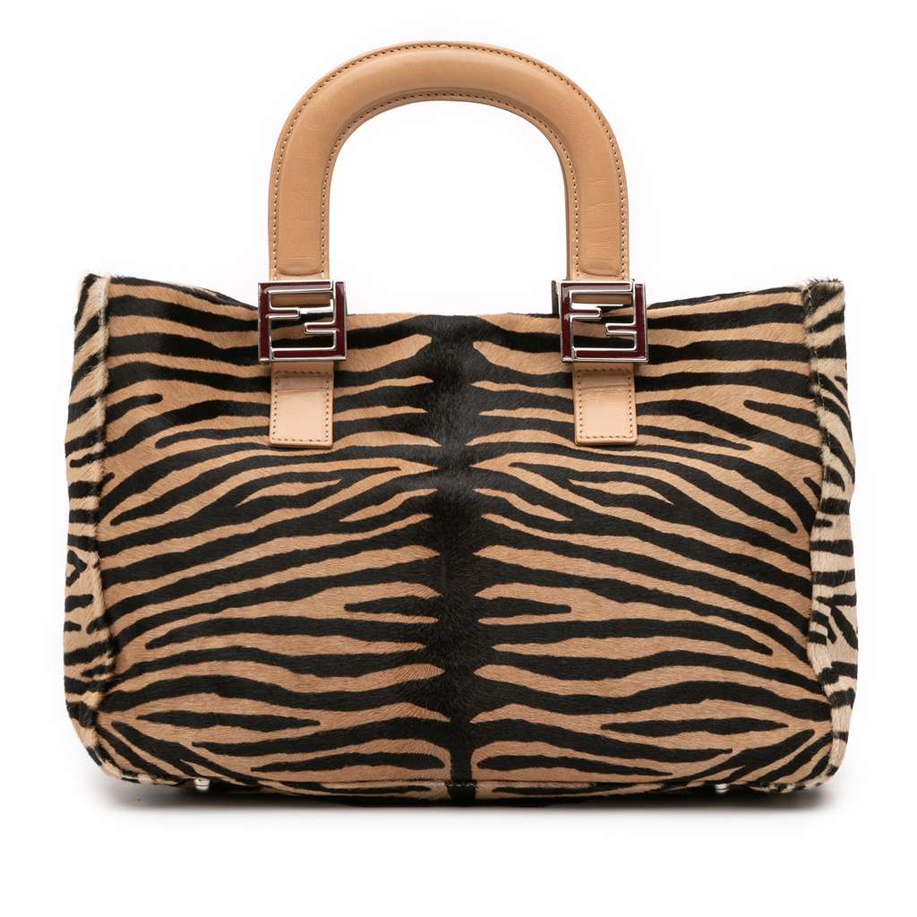 This tote features a printed pony hair body, a flat leather shoulder strap, an open top with magnetic snap closure, and an interior zip pocket.