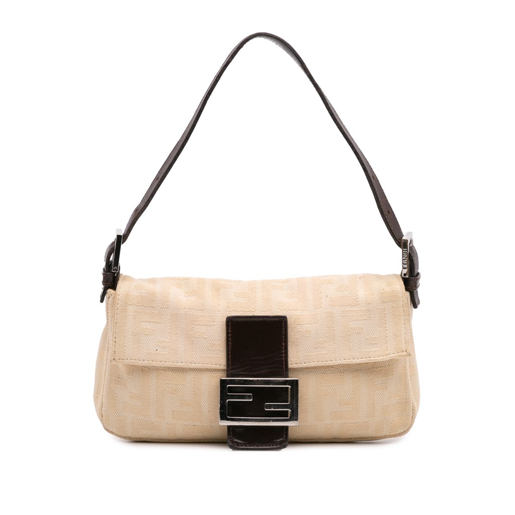 The Baguette features a canvas body, a flat leather strap, a front flap with a flat leather strap and magnetic snap closure, and an interior zip pocket. Strap has been replaced.