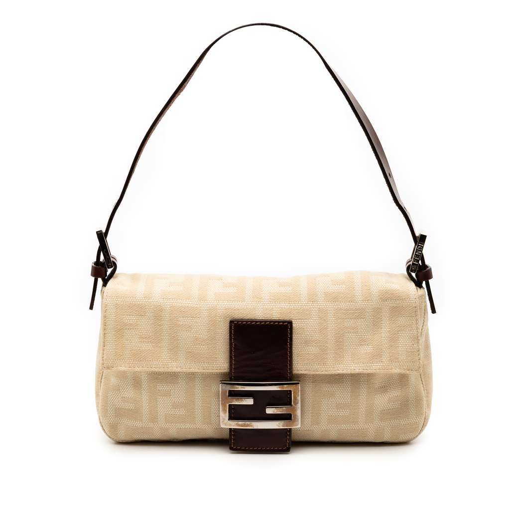 The Baguette features a canvas body, a flat leather strap, a front flap with a flat leather strap and magnetic snap closure, and an interior zip pocket.