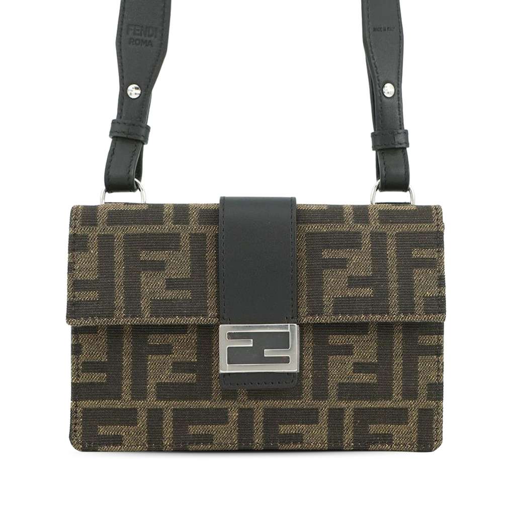 This crossbody bag features a canvas body, a detachable flat leather strap, a front flap with snap button closure, and an interior zip pocket.