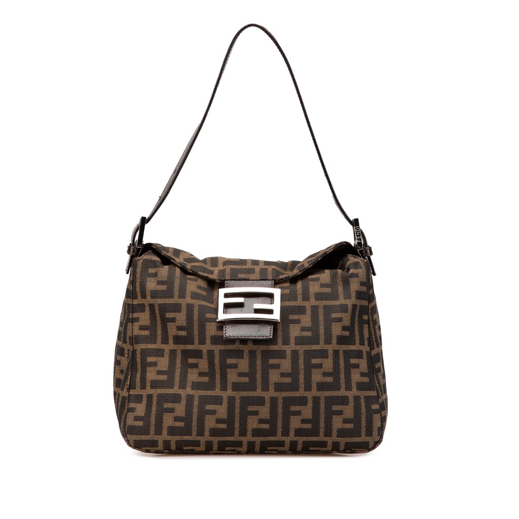 This shoulder bag features a canvas body, an adjustable flat leather strap, double flaps with magnetic snap closure, and an interior zip pocket.