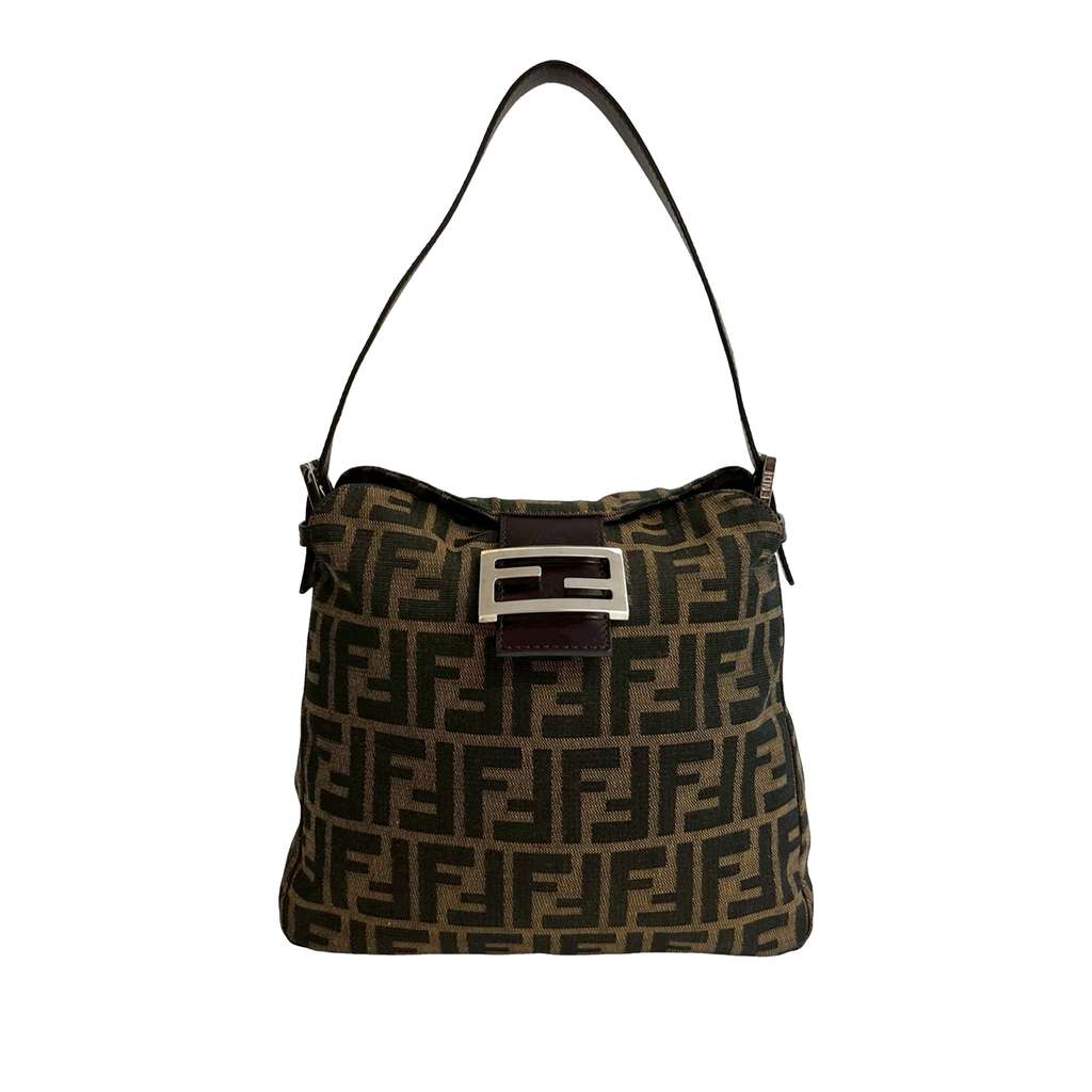 This shoulder bag features a canvas body, an adjustable flat leather strap, double flaps with magnetic snap closure, and an interior zip pocket.