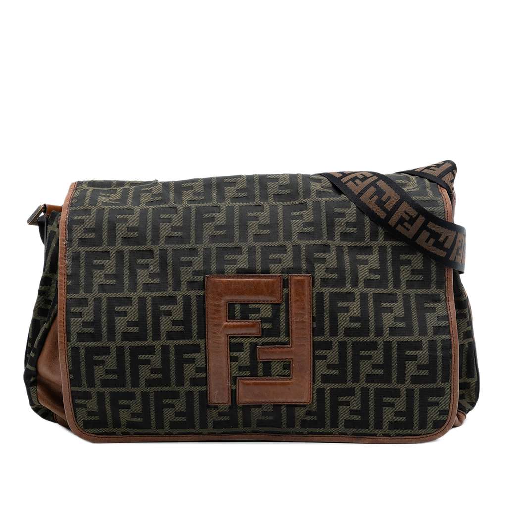 This crossbody bag features a canvas body with leather trim, a flat canvas shoulder strap, a front flap with snap closure, and an interior zip pocket.