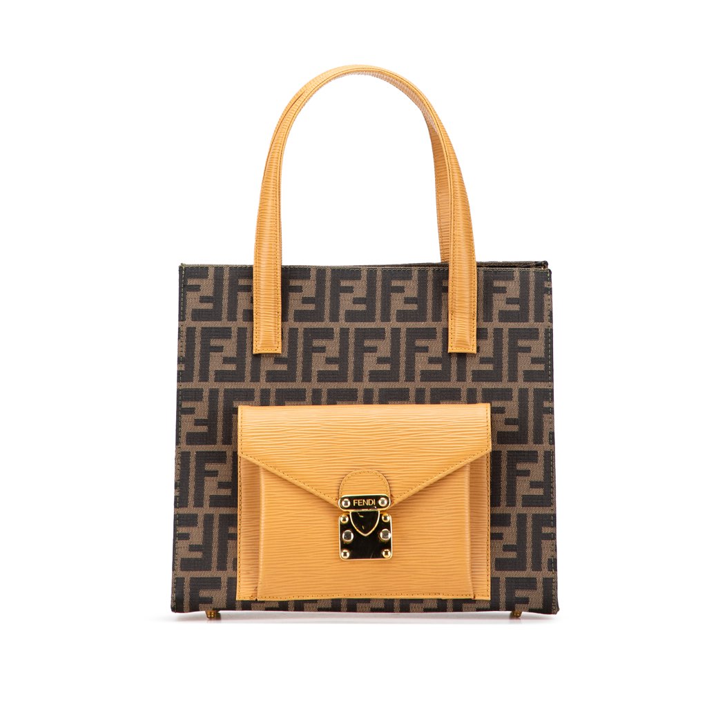 This satchel features a canvas body, flat leather handles, an open top with magnetic snap closure, an exterior front flap pocket, and an interior zip pocket.