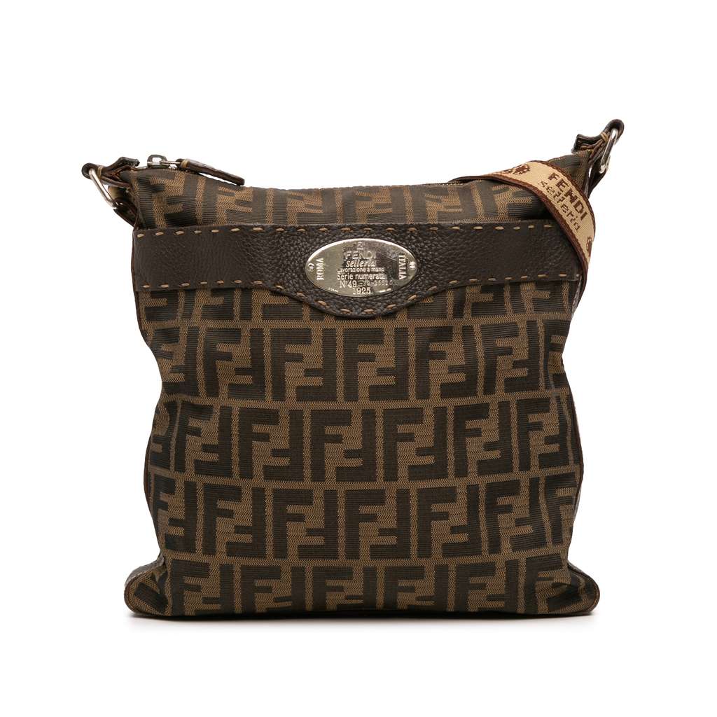 This crossbody bag features a canvas body with leather trim, an adjustable flat leather strap, a top zip closure, and an interior zip pocket.