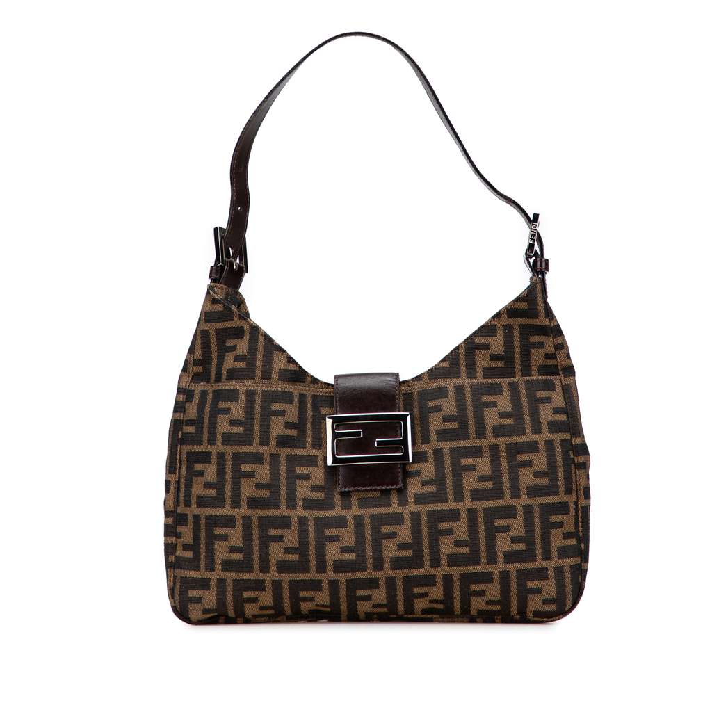 This shoulder bag features a canvas body, a flat leather strap, an open top with a flat strap and magnetic snap closure, an exterior front slip pocket, and an interior zip pocket.