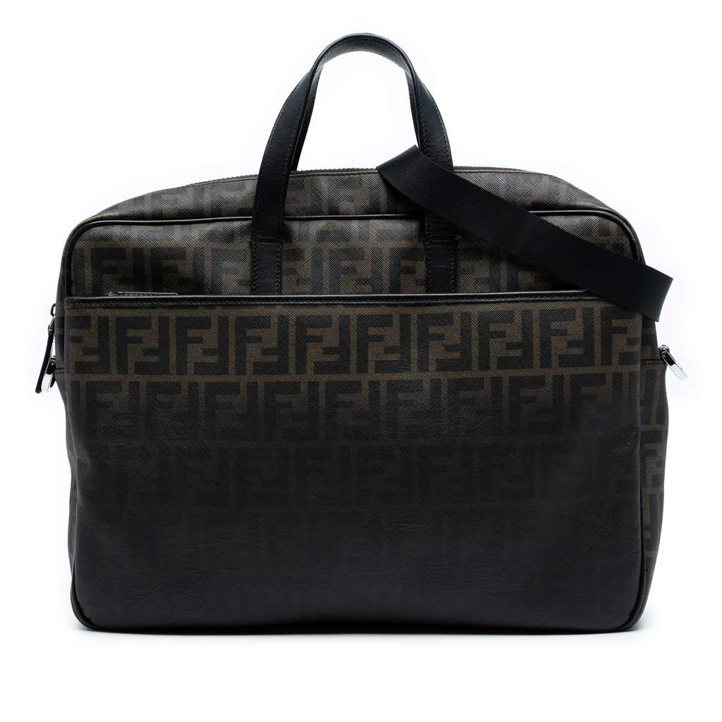 This business bag features a coated canvas body with leather trim, flat leather handles, a detachable flat leather shoulder strap, a top zip closure, an exterior front zip compartment, and an interior zip pocket.