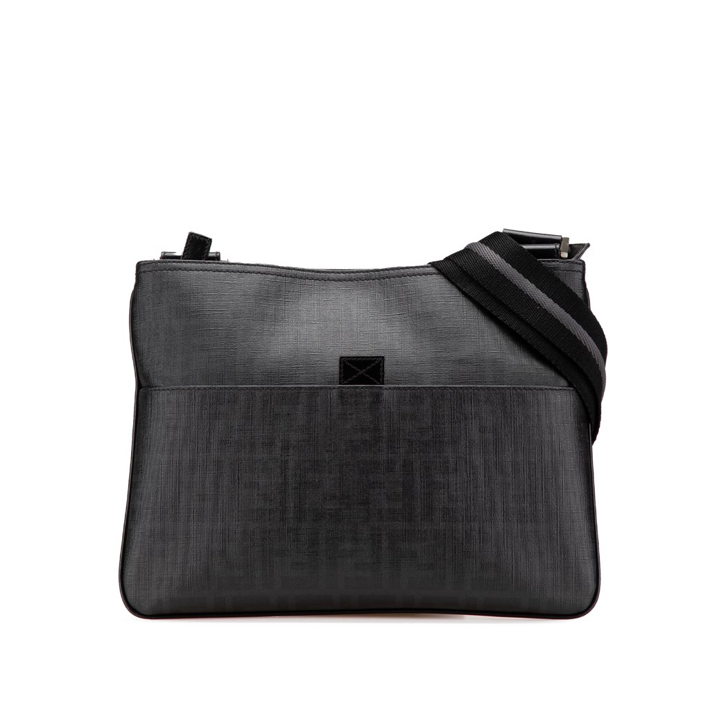 This crossbody bag features a coated canvas body with leather trim, an adjustable flat canvas strap, a top zip closure, an exterior front slip pocket, and an interior slip pocket.