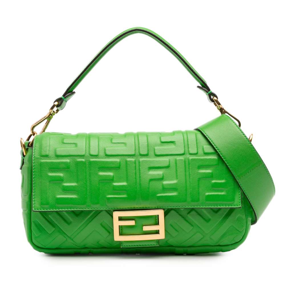 The Baguette satchel features an embossed leather body, a flat leather handle, a detachable flat leather strap, a front flap with magnetic snap closure, and an interior zip pocket.