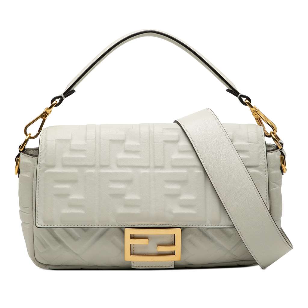 The Baguette satchel features an embossed leather body, a flat leather handle, a detachable flat leather shoulder strap, a front flap with magnetic snap closure, and an interior zip pocket.