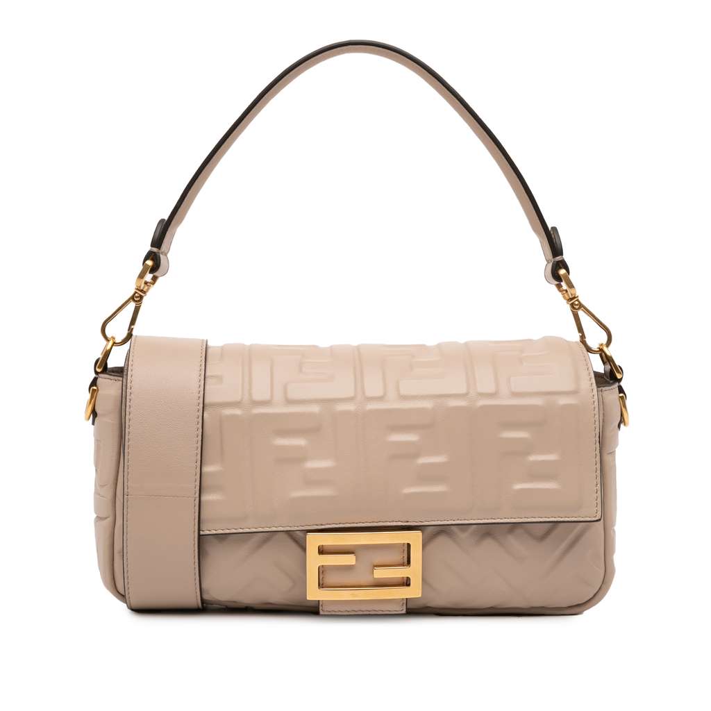 The Baguette satchel features an embossed leather body, a flat leather handle, a detachable flat leather strap, a front flap with magnetic snap closure, and an interior zip pocket.