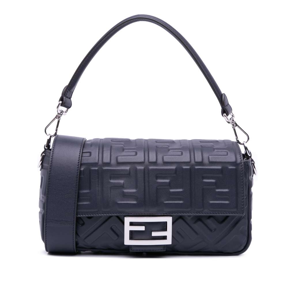 The Baguette features an embossed leather body, a flat leather handle, a detachable flat leather strap, a front flap with magnetic snap button closure, and an interior zip pocket.