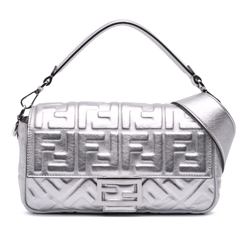 This satchel features an embossed leather body, a flat leather handle, a detachable flat leather strap, a front flap with magnetic snap closure, and an interior zip pocket.