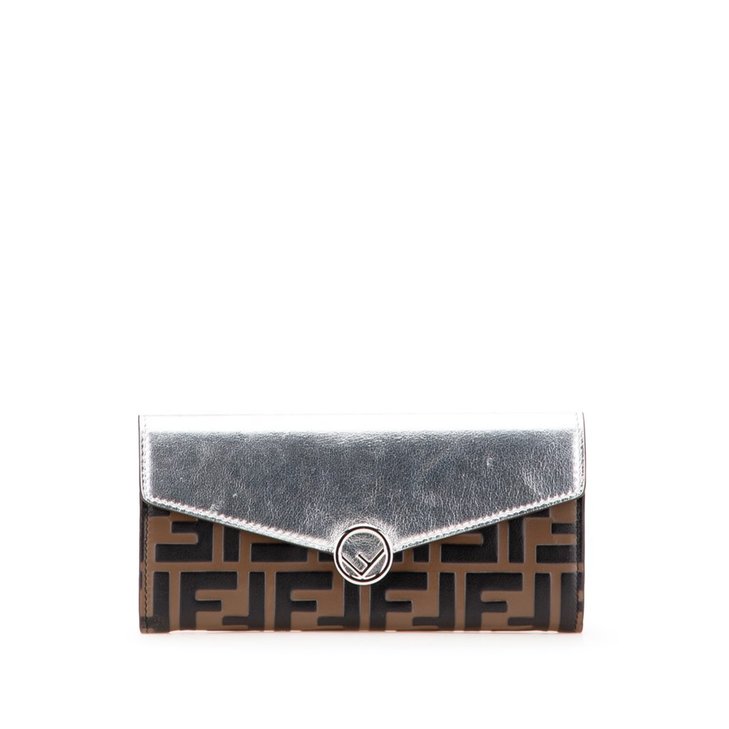 The F is Fendi wallet features an embossed leather body with metallic leather trim, a metallic leather front flap with a snap button closure, and interior zip and slip compartments.