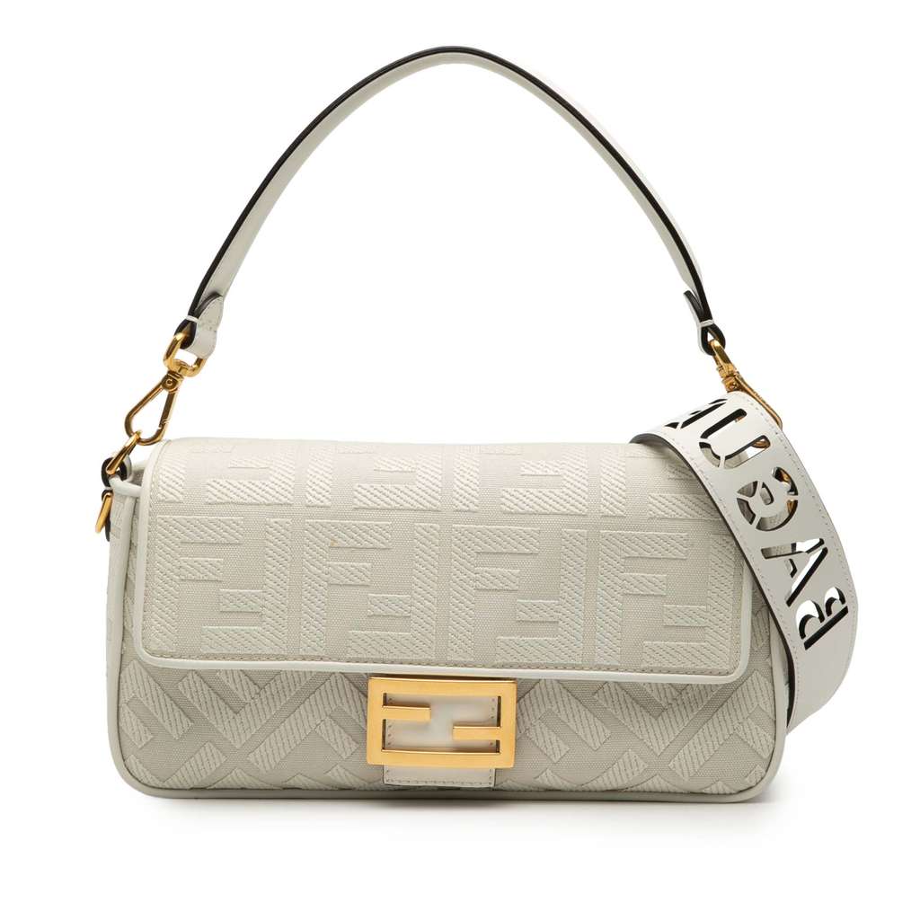 The Baguette features an embroidered canvas body with leather trim, a detachable leather top handle, a detachable canvas strap, a front flap with magnetic snap closure, and an interior zip pocket.