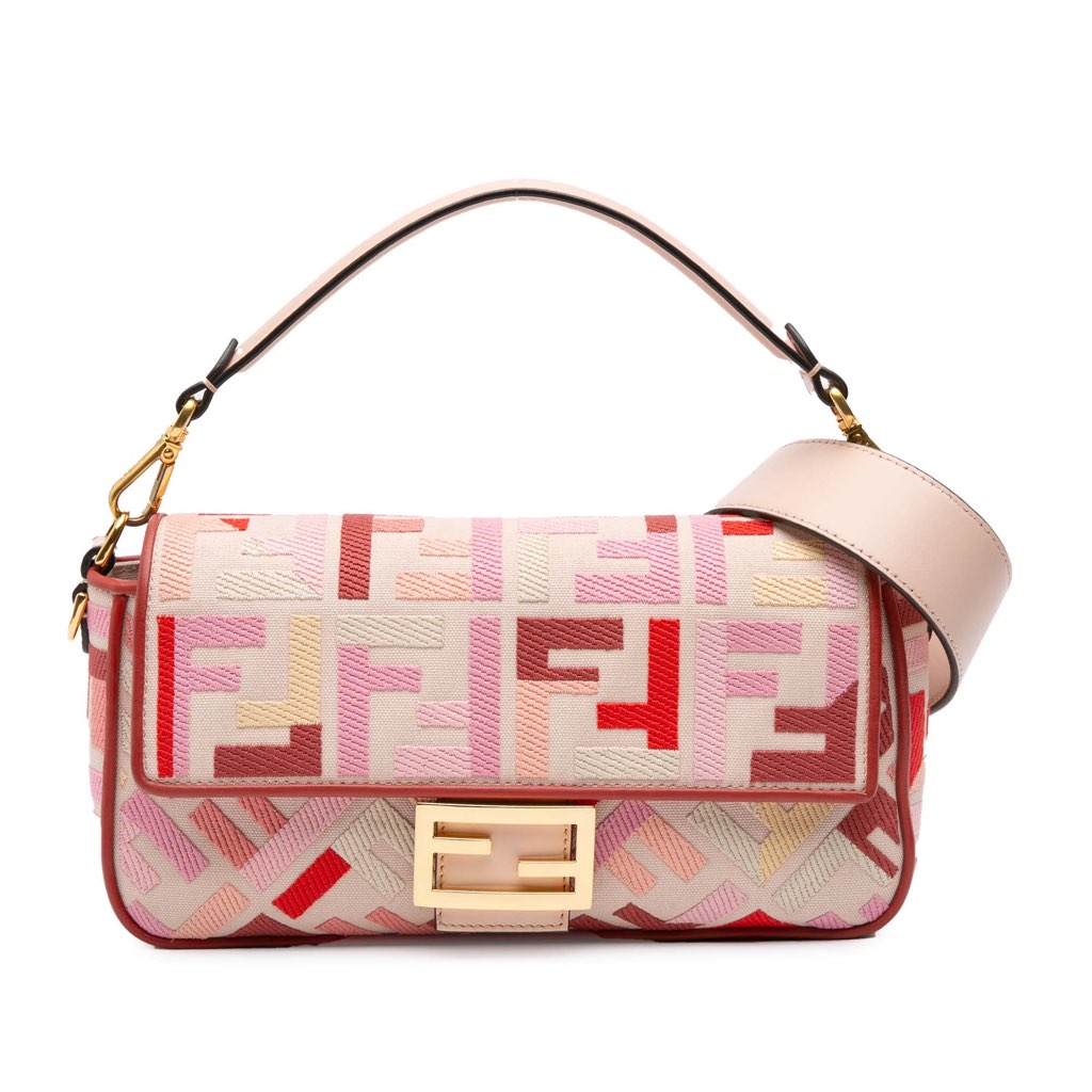 The Baguette features an embroidered canvas body with leather trim, a detachable leather top handle, a detachable leather strap, a front flap with magnetic closure, and an interior zip pocket.
