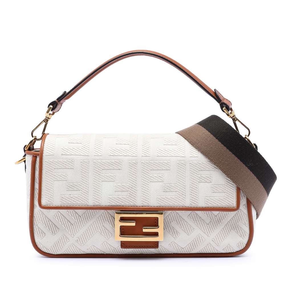 The Baguette features an embroidered canvas body with leather trim, a detachable leather top handle, a detachable canvas strap, a front flap with magnetic snap closure, and an interior zip pocket.