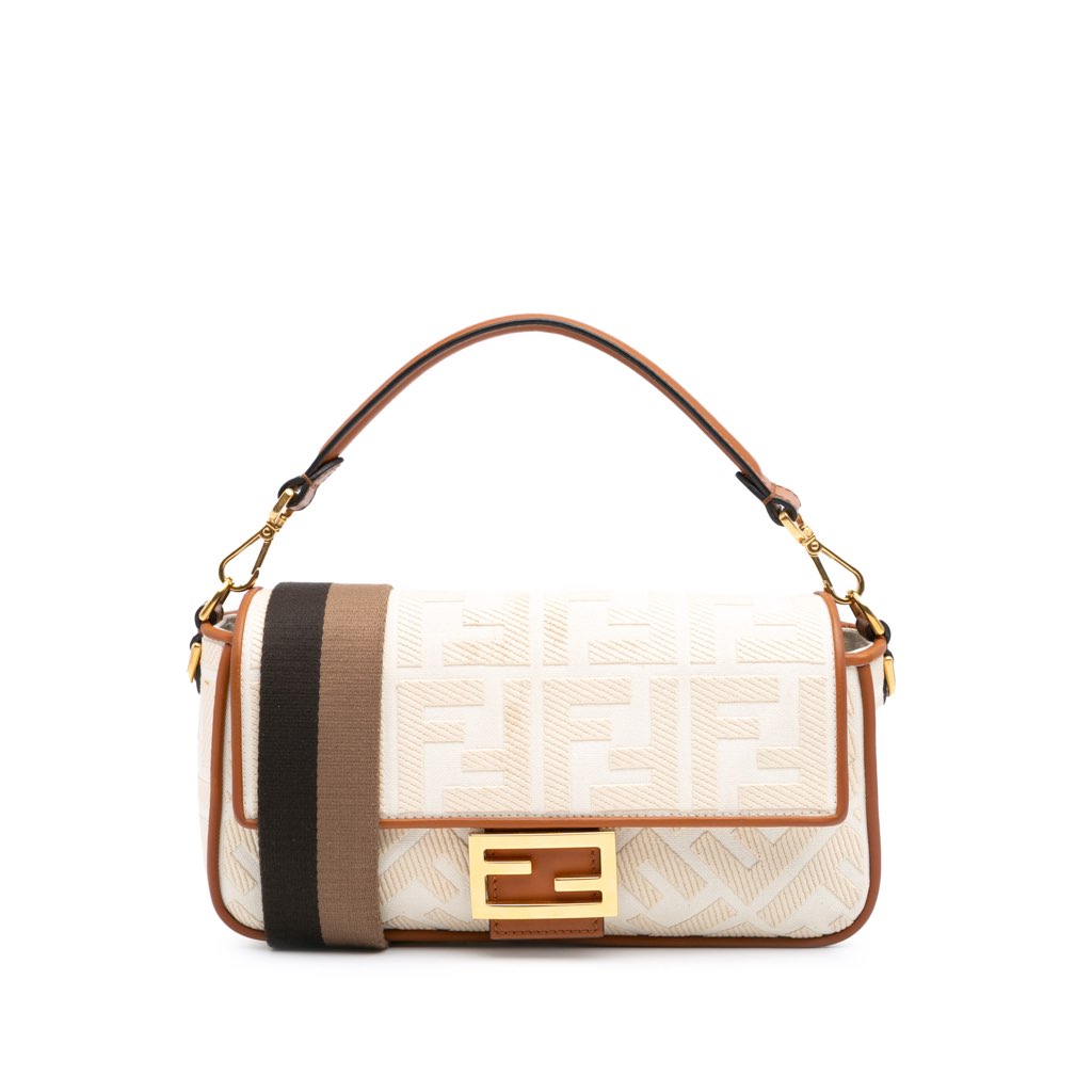 The Baguette features an embroidered canvas body with leather trim, a detachable leather top handle, a detachable canvas strap, a front flap with magnetic snap closure, and an interior zip pocket.