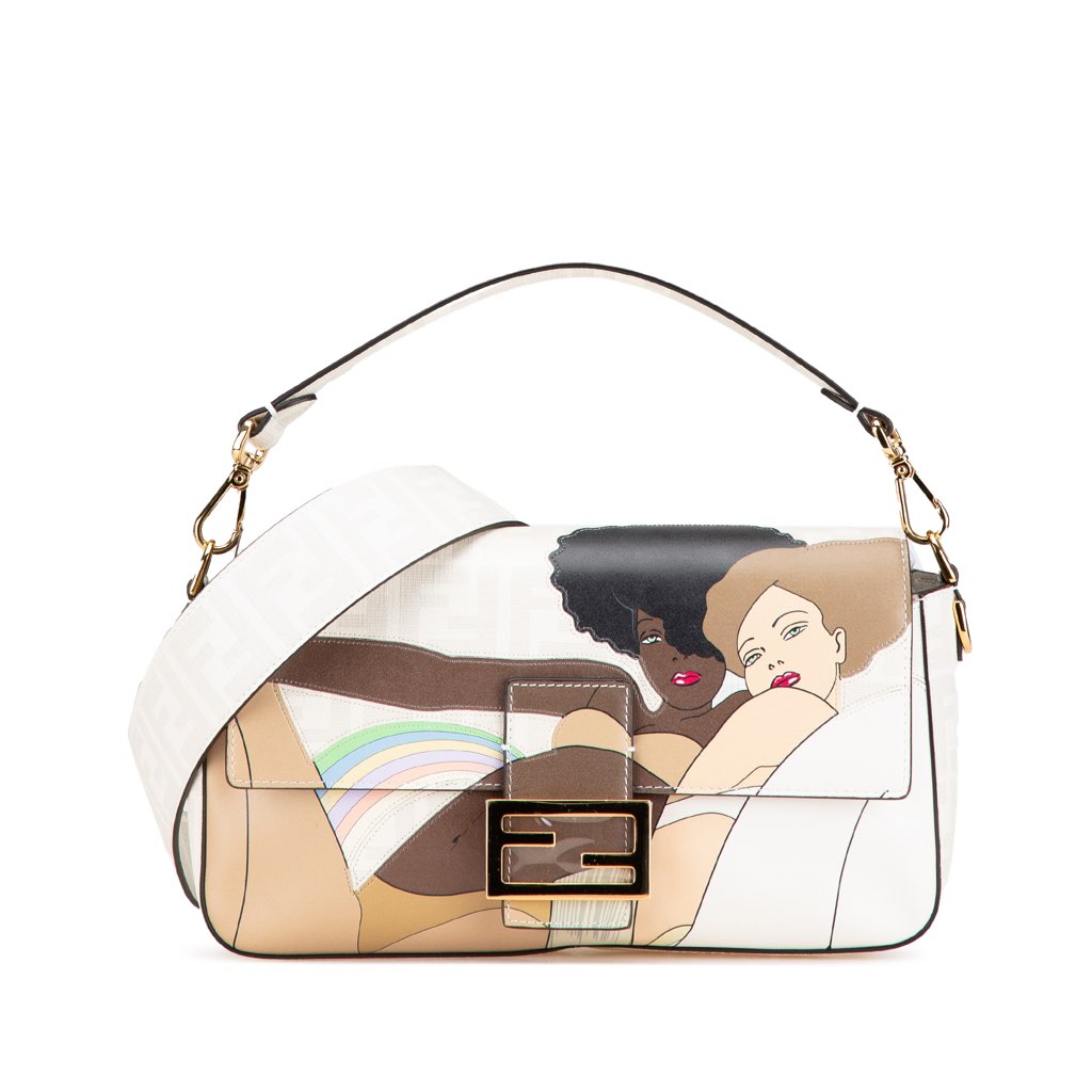 The Baguette features a printed coated canvas body, a detachable flat leather handle, a detachable flat strap, a front flap with magnetic snap closure, and an interior zip pocket.