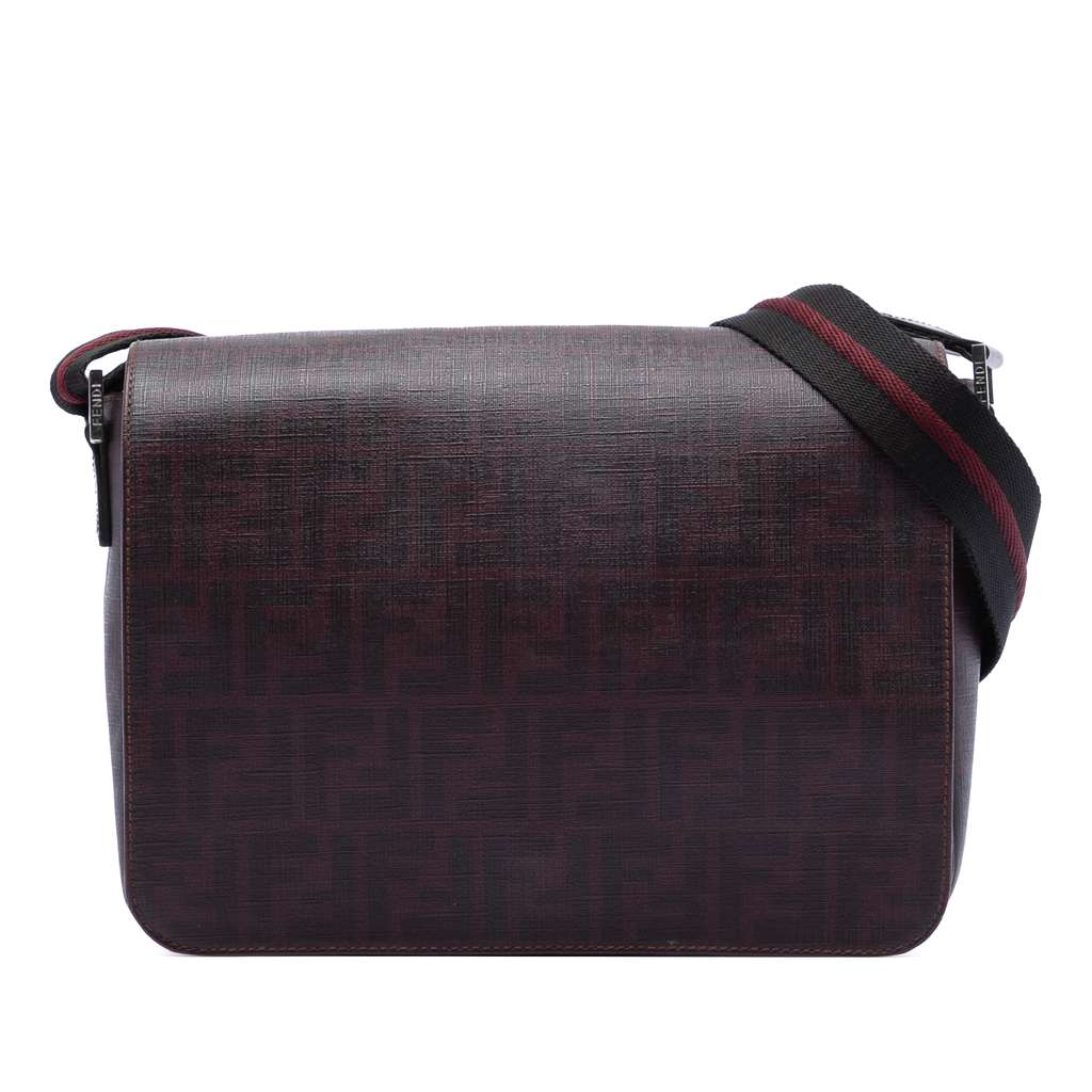 This crossbody bag features a coated canvas body with leather trim, an adjustable flat canvas strap, a front flap with magnetic snap closure, an exterior back slip pocket, and an interior zip pocket.