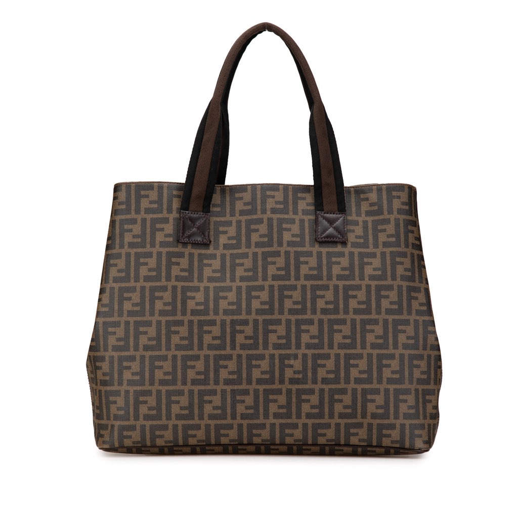 This tote bag features a coated canvas body, flat leather straps, an open top, and an interior zip pocket.