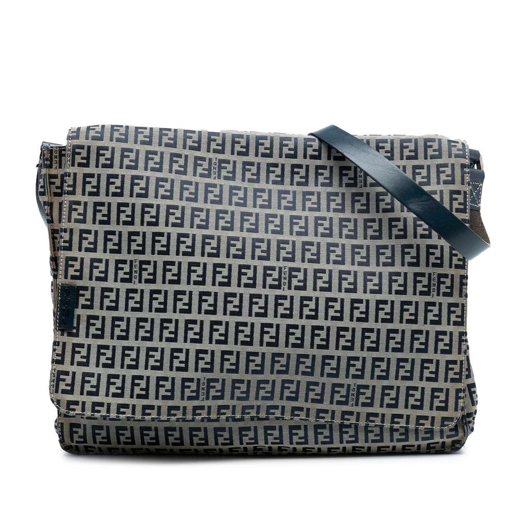 This crossbody bag features a canvas body with leather trim, an adjustable flat leather strap, a flap with magnetic snap closure, and an interior zip pocket.