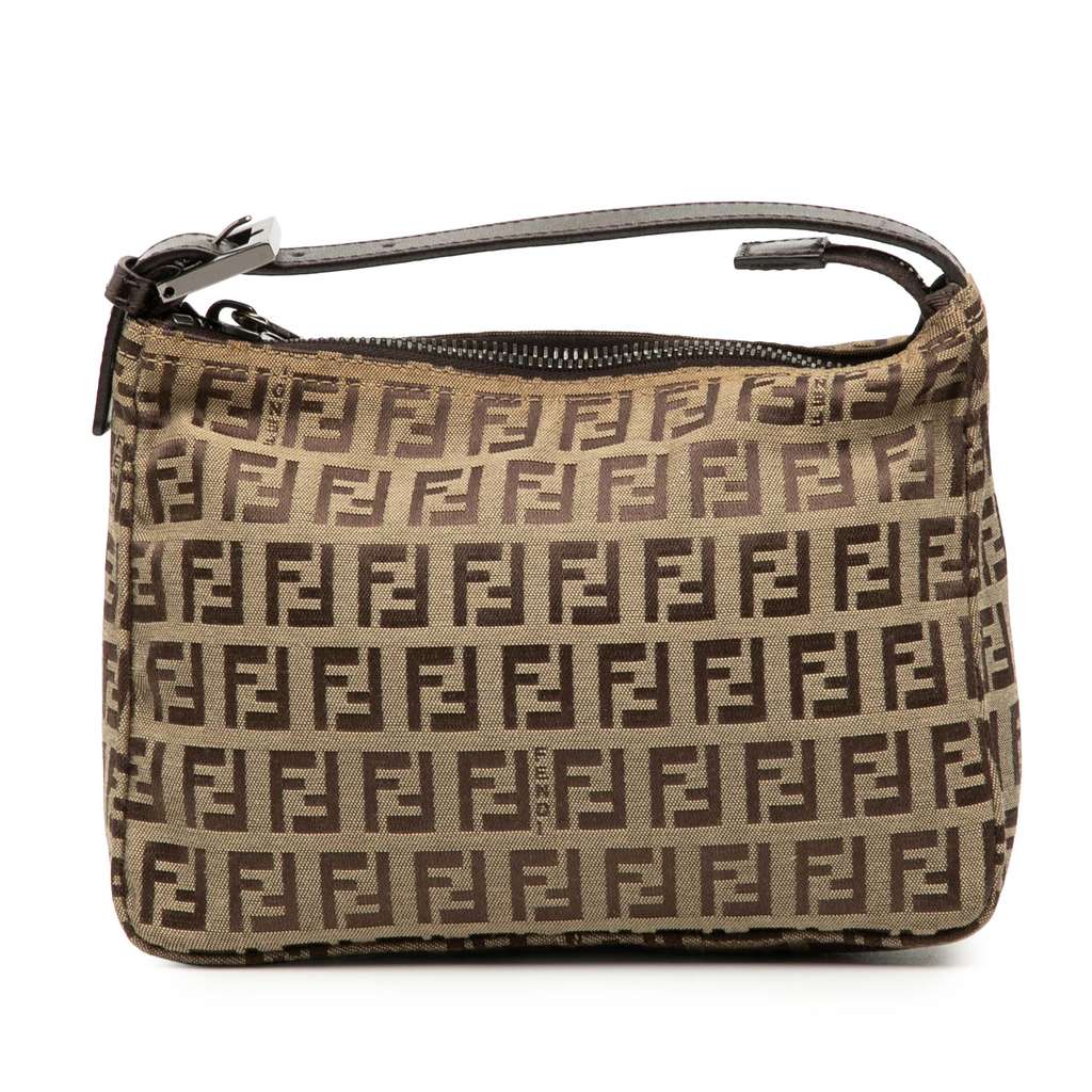 This handbag features a canvas body, a flat leather handle, and a top zip closure.