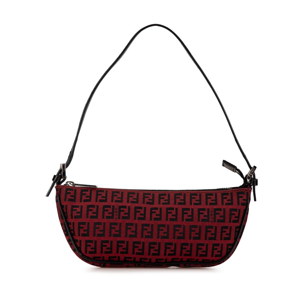 This shoulder bag features a canvas body with leather trim, a flat leather shoulder strap, and a top zip closure.