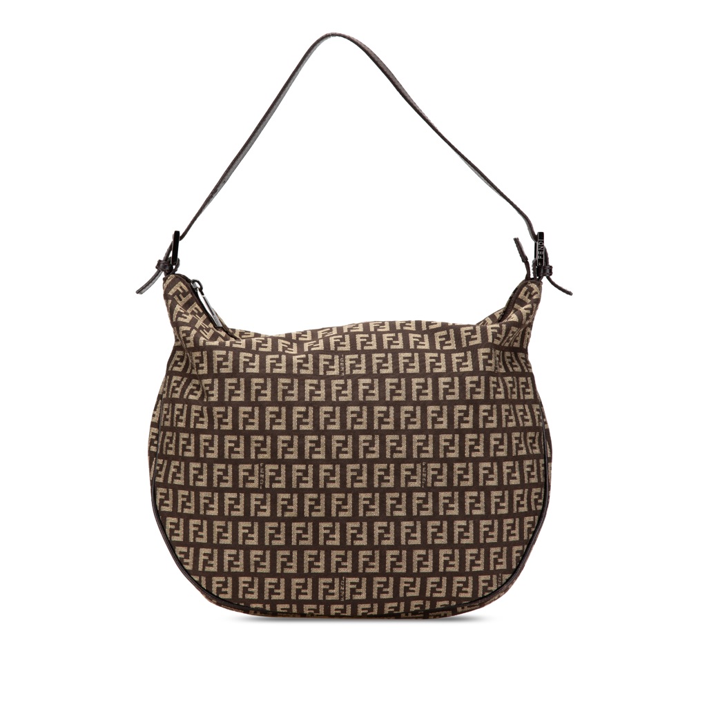 This shoulder bag features a canvas body with leather trim, a flat leather strap, a top zip closure, and an interior slip pocket.
