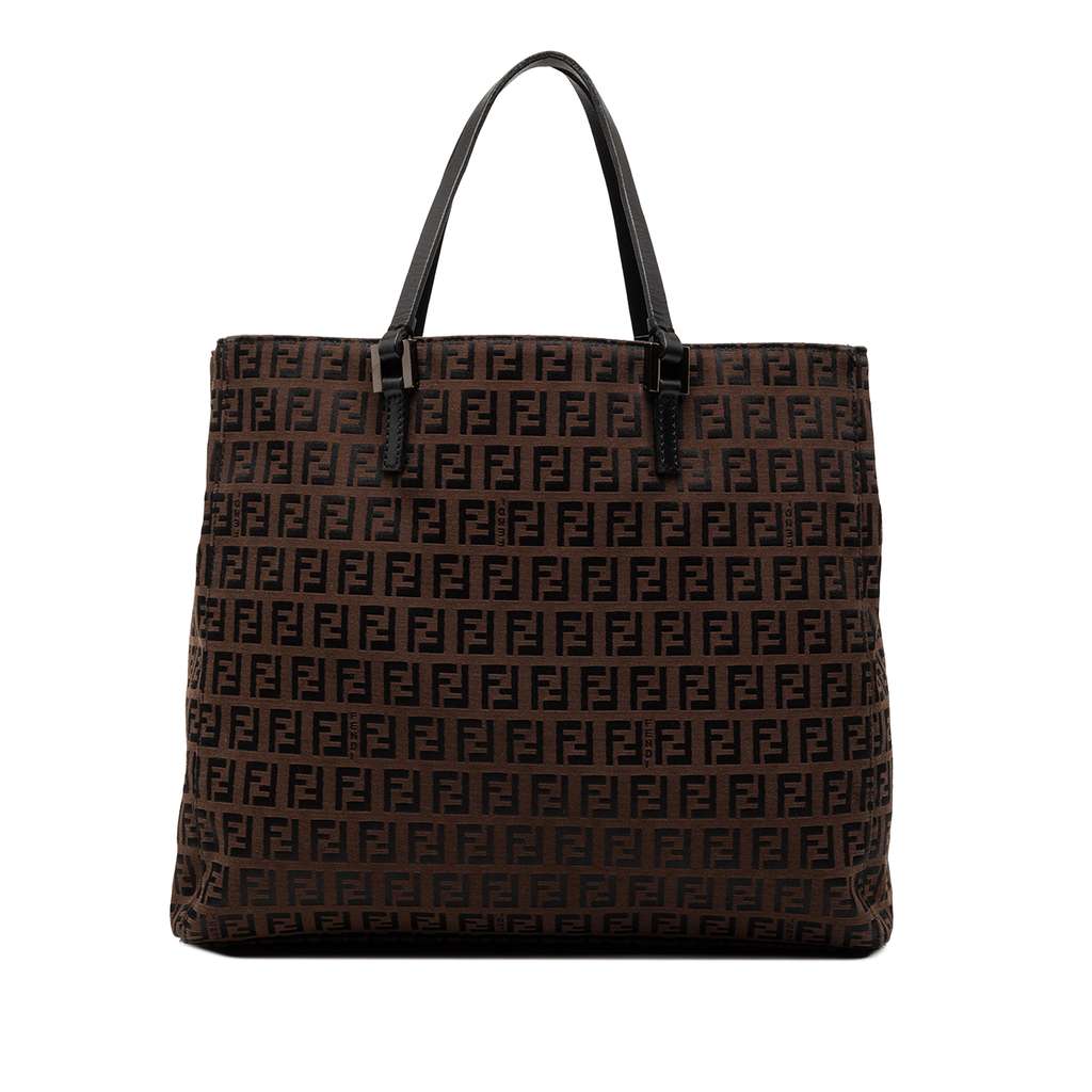 This tote bag features a canvas body, flat leather handles, an open top, an interior center zip compartment, and an interior zip pocket.