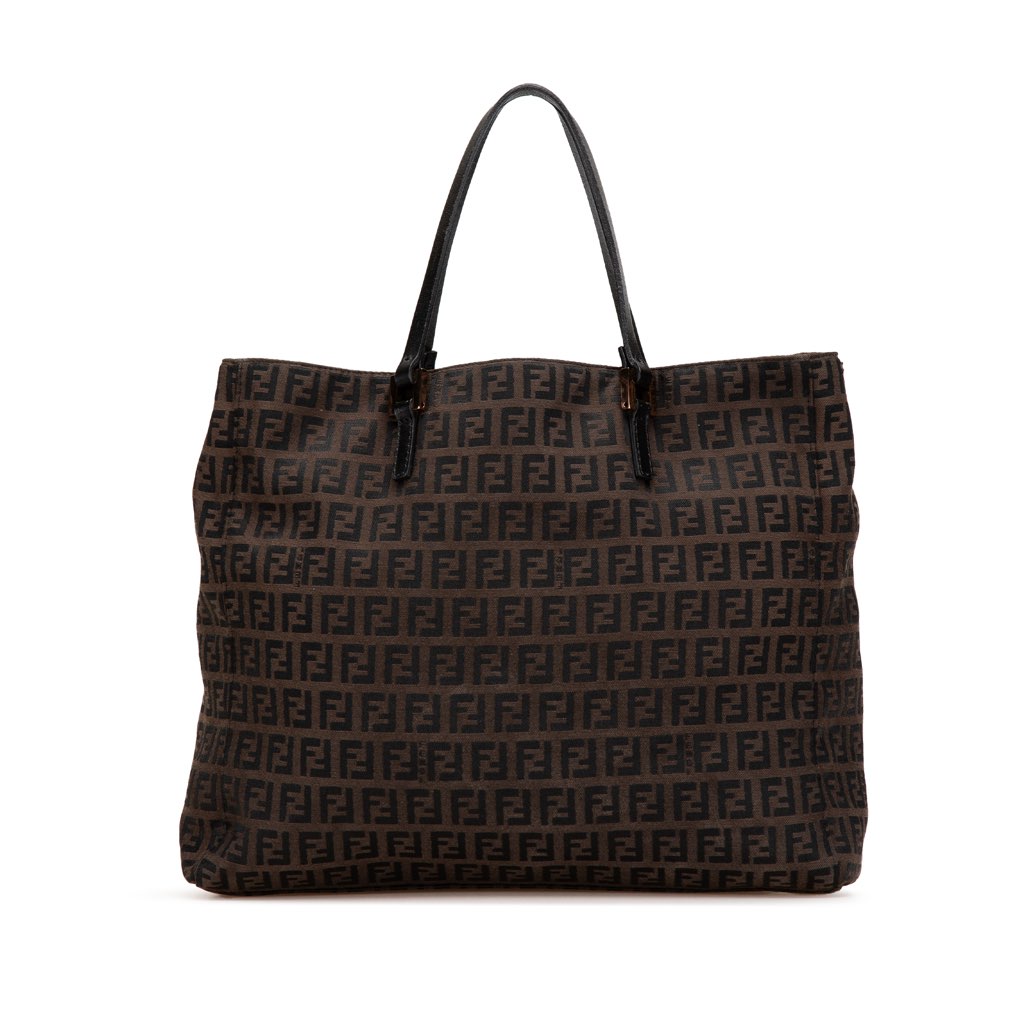 This tote bag features a canvas body, flat leather handles, an open top, and interior zip and slip compartments.