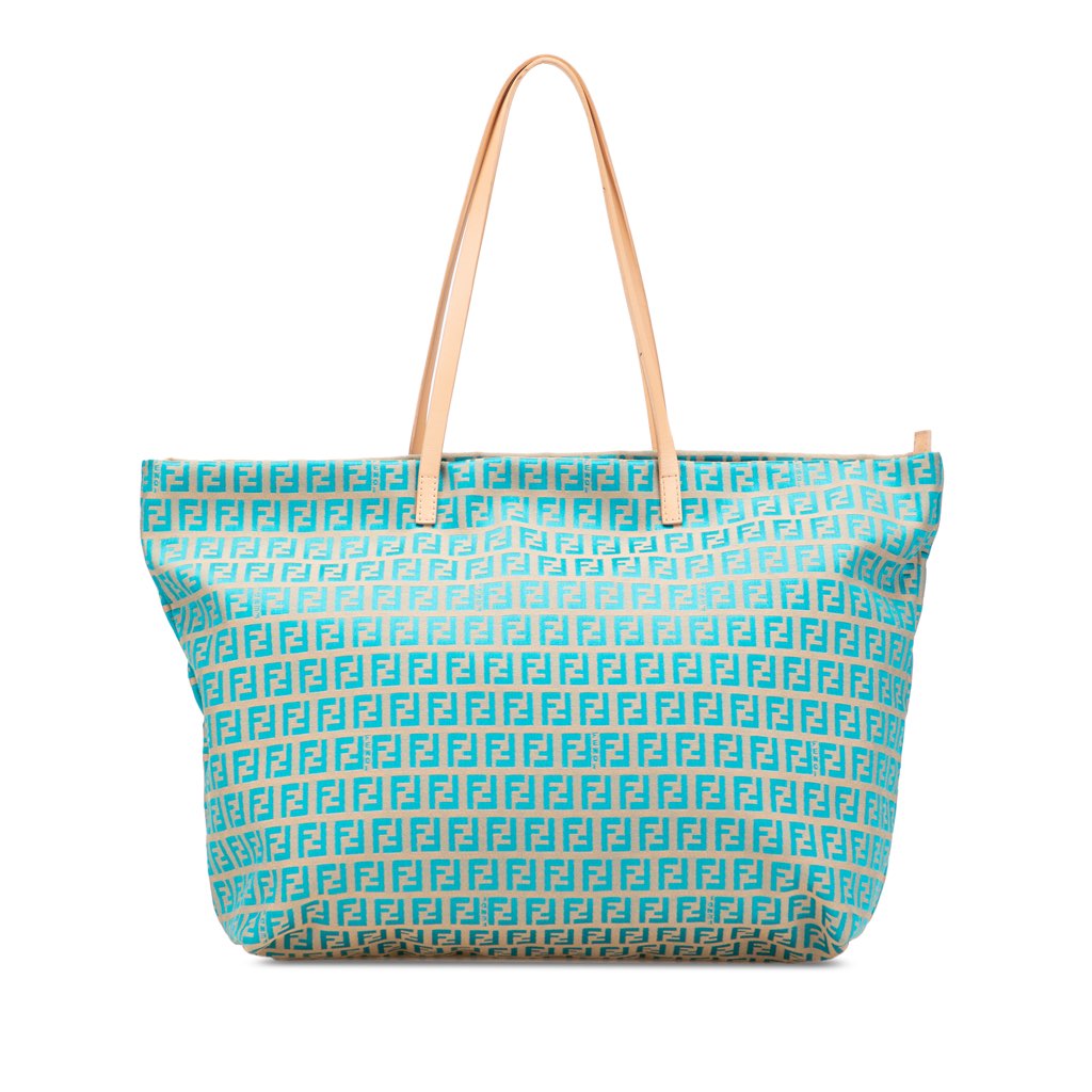 This tote bag features a canvas body with leather trim, flat leather handles, and a top zip closure.