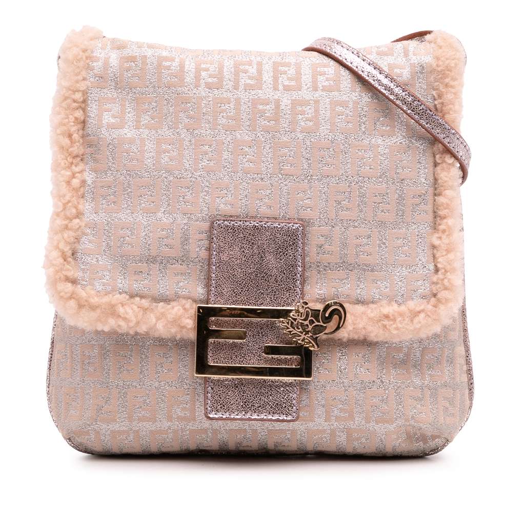 This crossbody bag features a canvas body with shearling trim, an adjustable flat leather strap, a front flap with magnetic snap closure, and an interior slip pocket.