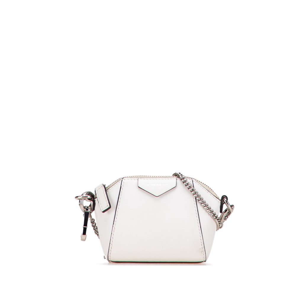 This crossbody bag features a leather body, a detachable chain link strap, and a top zip closure.