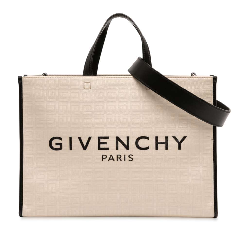 The G Tote bag features a canvas body, flat leather handles, a detachable flat leather strap, an open top, and an interior slip pocket.