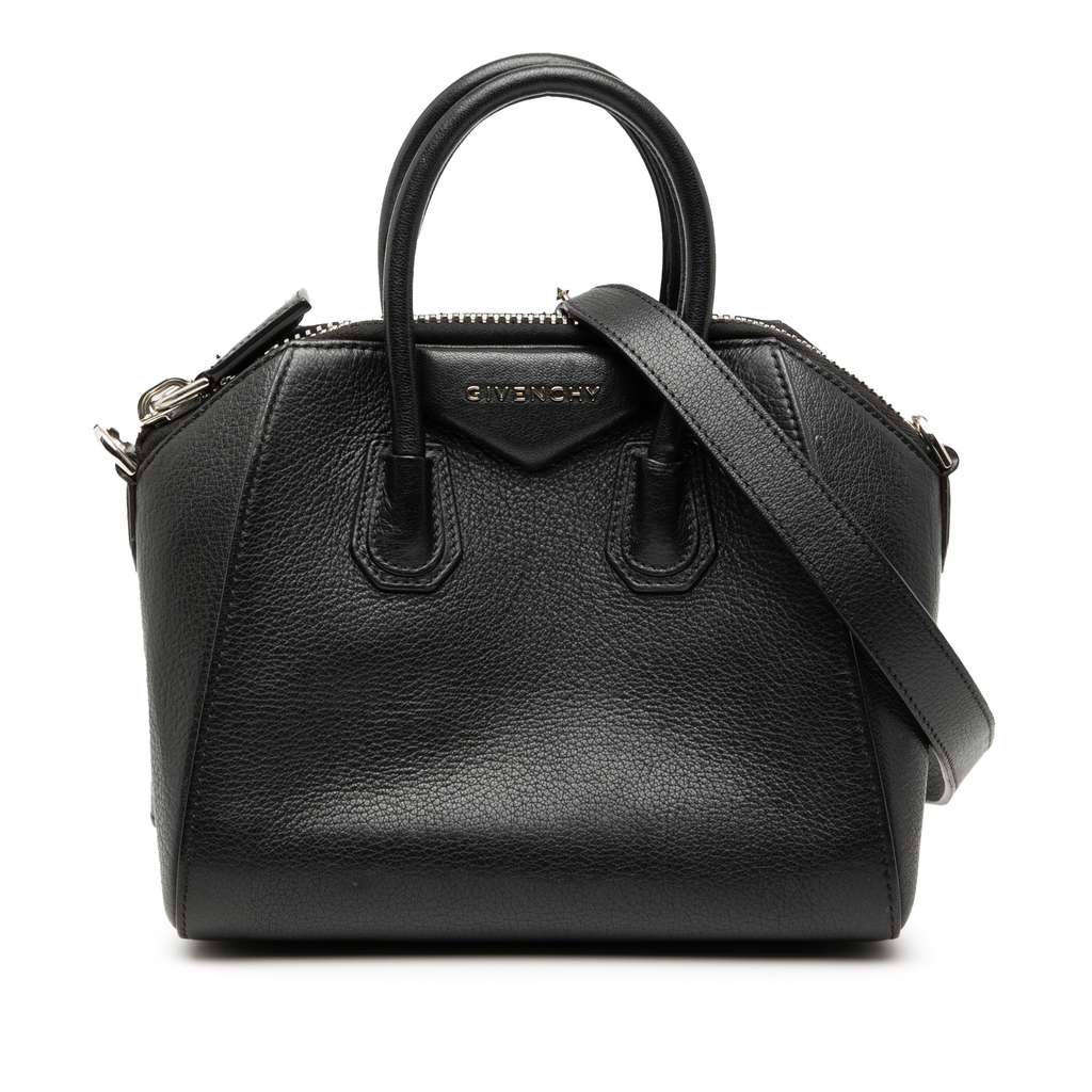 The Antigona features a leather body, rolled leather handles, a detachable flat leather shoulder strap, a top zip closure, and interior zip and slip pockets.