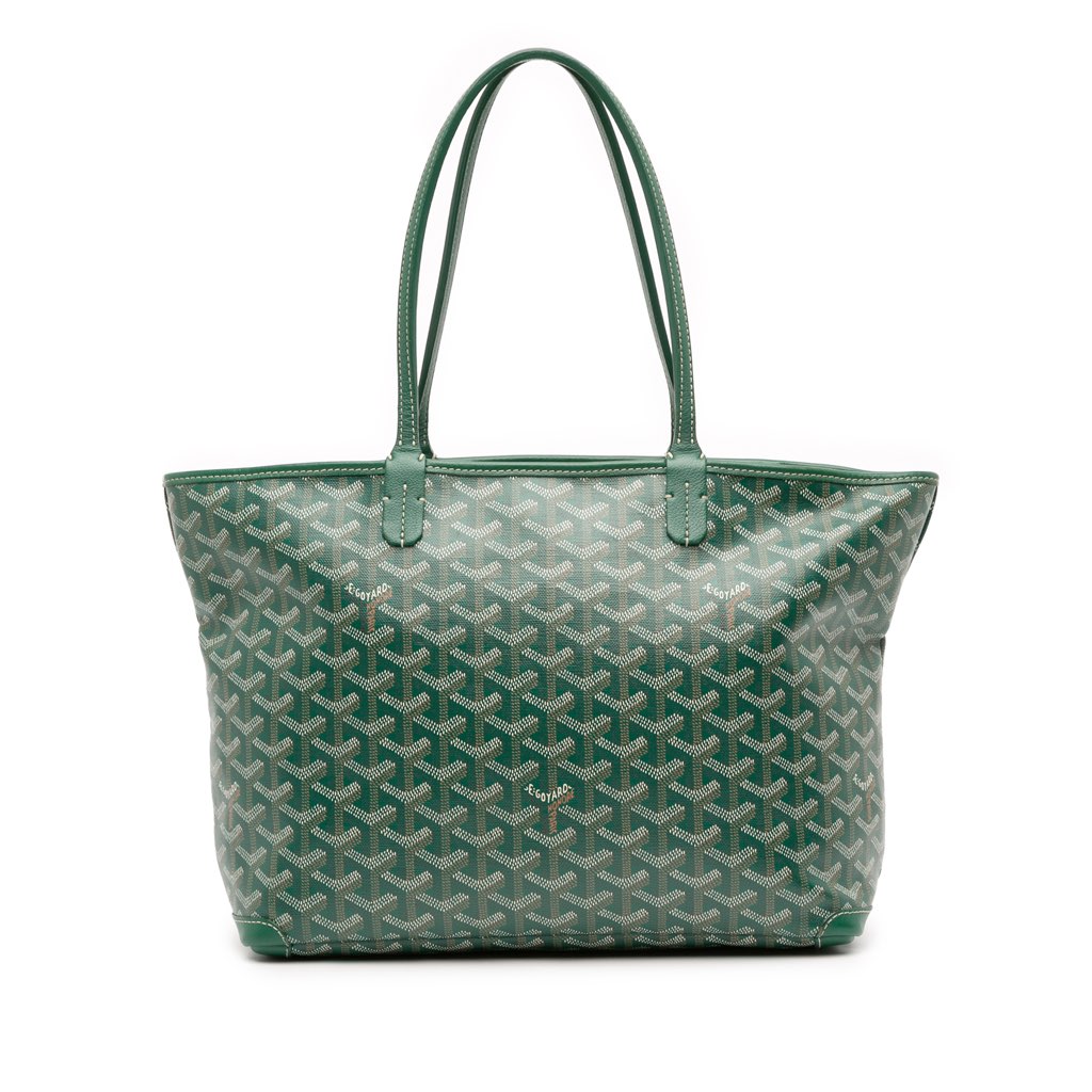 The Goyardine Artois PM features a coated canvas body with leather trim, flat leather straps, and a top zip closure.
