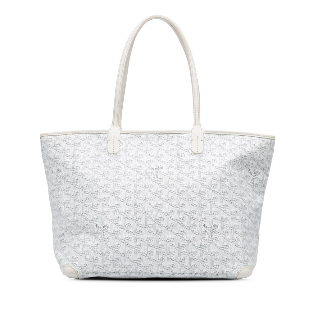 The Goyardine Artois PM features a coated canvas body with leather trim, flat leather straps, a top zip closure, and an interior zip pocket.