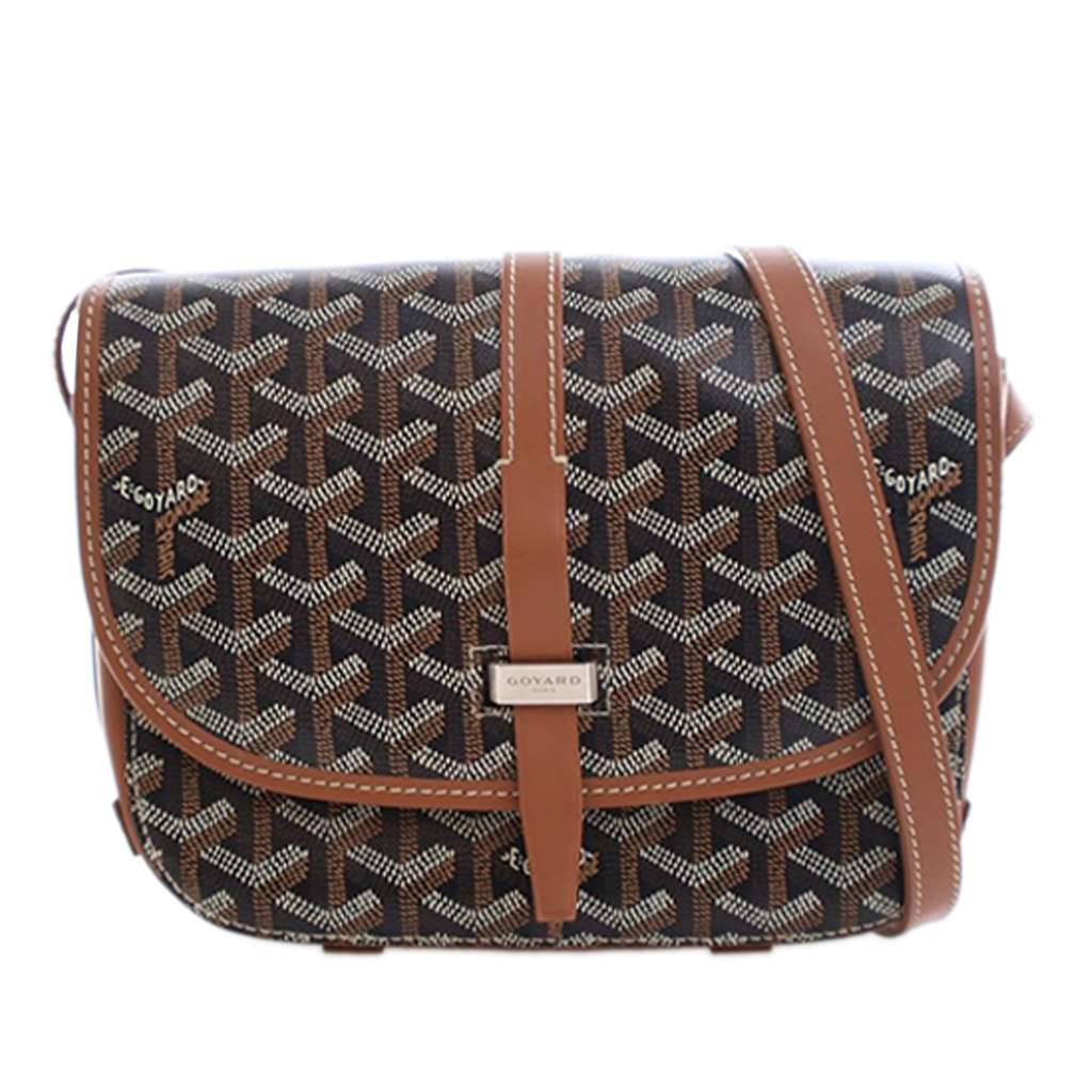 The Goyardine Belvedere PM features a coated canvas body with leather trim, an adjustable flat leather strap, a front flap with buckle closures, an exterior back slip pocket, and interior slip pockets.