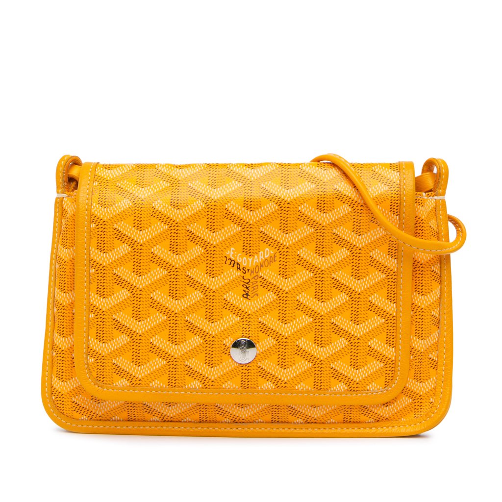 The Plumet features a coated canvas body with leather trim, a flat leather strap, a front flap with magnetic snap closure, an exterior back slip pocket, an interior zip compartment, and an interior slip pocket.