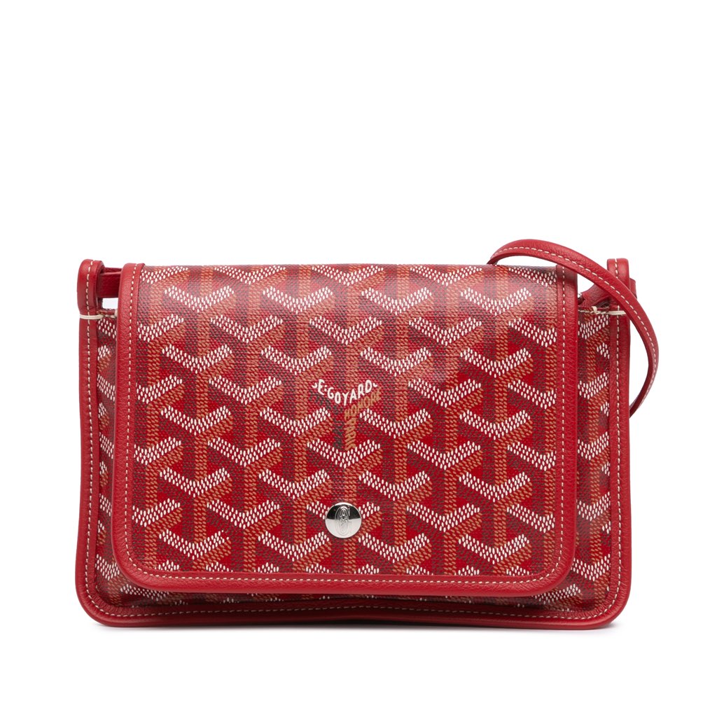 The Plumet features a coated canvas body, a rolled leather strap, a front flap with snap closure, interior zip and slip compartments, and an interior slip pocket.