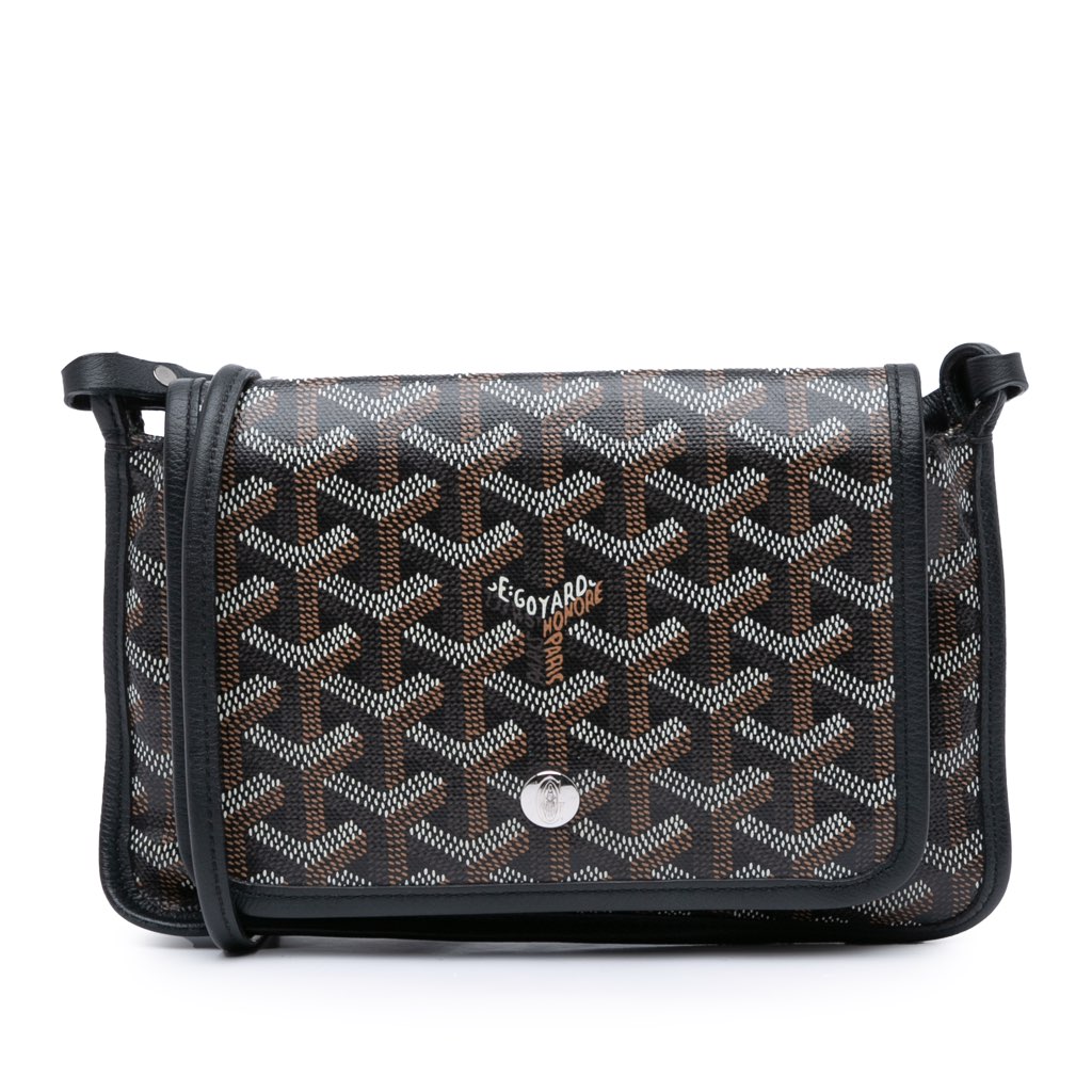 The Plumet features a coated canvas body, a rolled leather strap, a front flap with snap closure, interior zip and slip compartments, and an interior slip pocket.