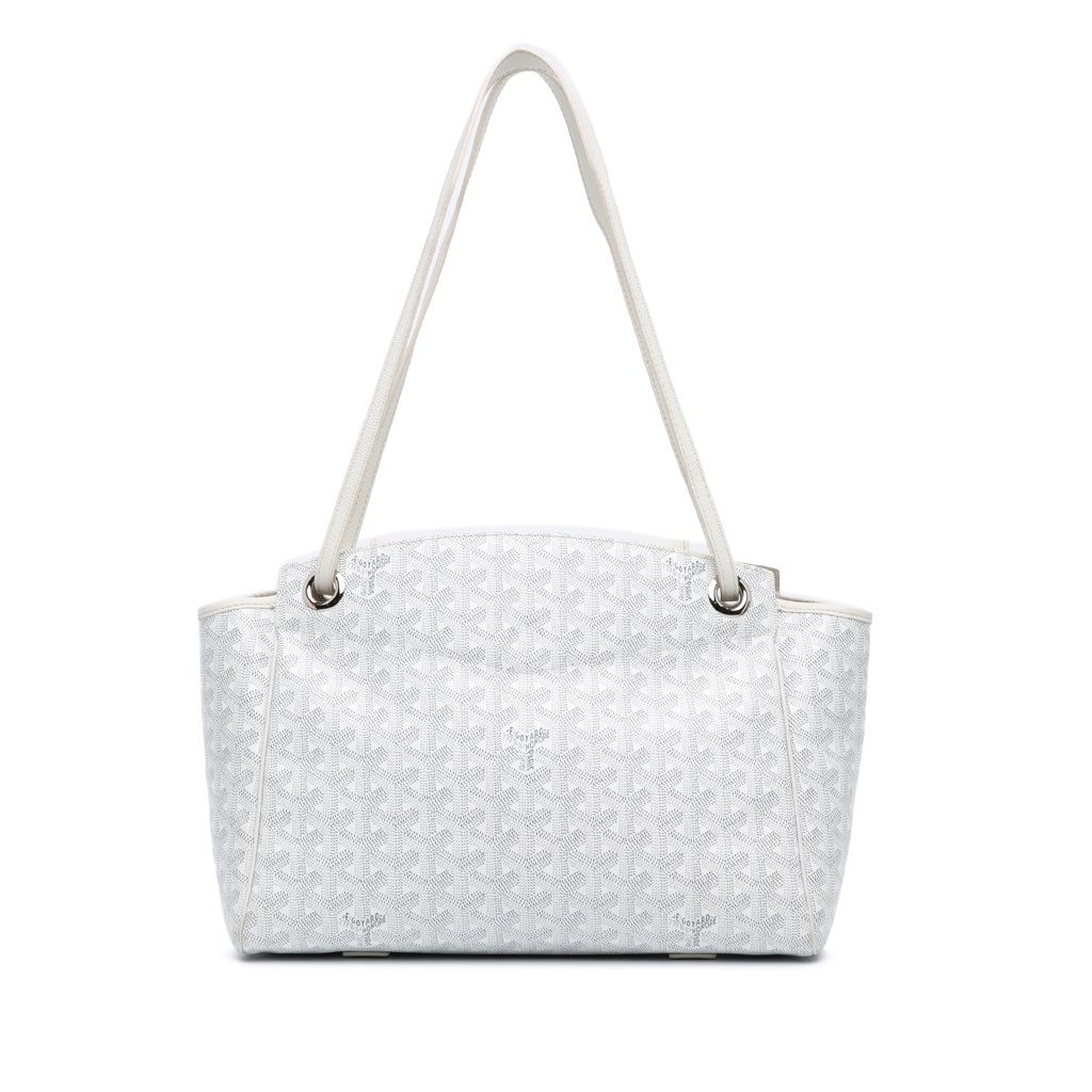 This shoulder bag features a coated canvas body with leather trim, flat leather shoulder straps, and an open top.