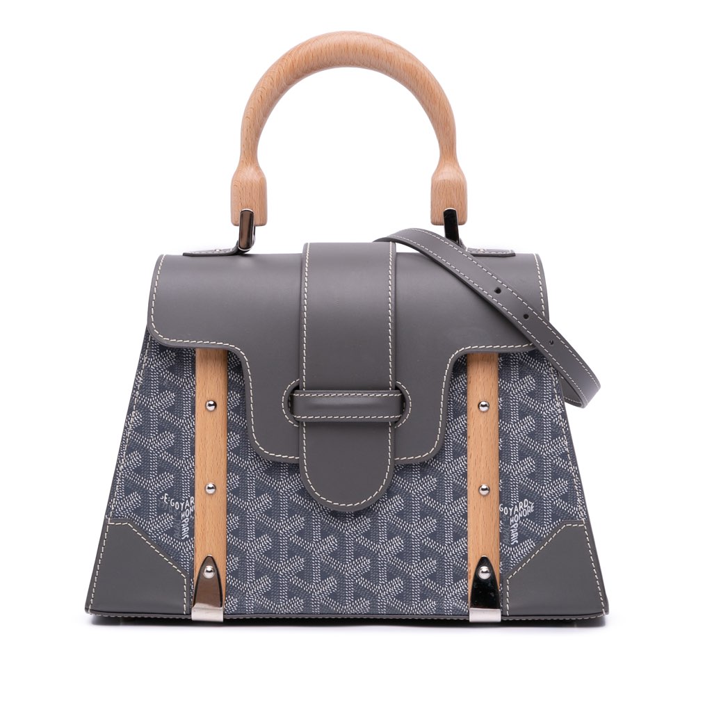The Goyardine Saigon PM features a coated canvas body with leather trim, a wooden top handle, a detachable flat leather strap, a front flap with slip-through closure, and an interior slip pocket.