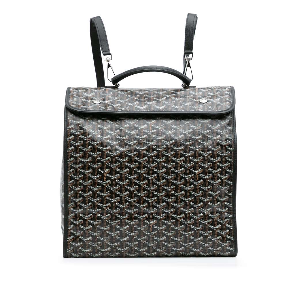 This backpack features a coated canvas body with leather trim, a rolled leather top handle, adjustable flat leather back straps, a top flap with snap button closures, an exterior back zip pocket, and an interior slip pocket.