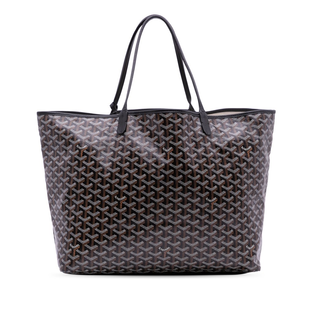 The Saint Louis GM features a coated canvas body, flat leather handles, an open top, and an interior flap pouch.
