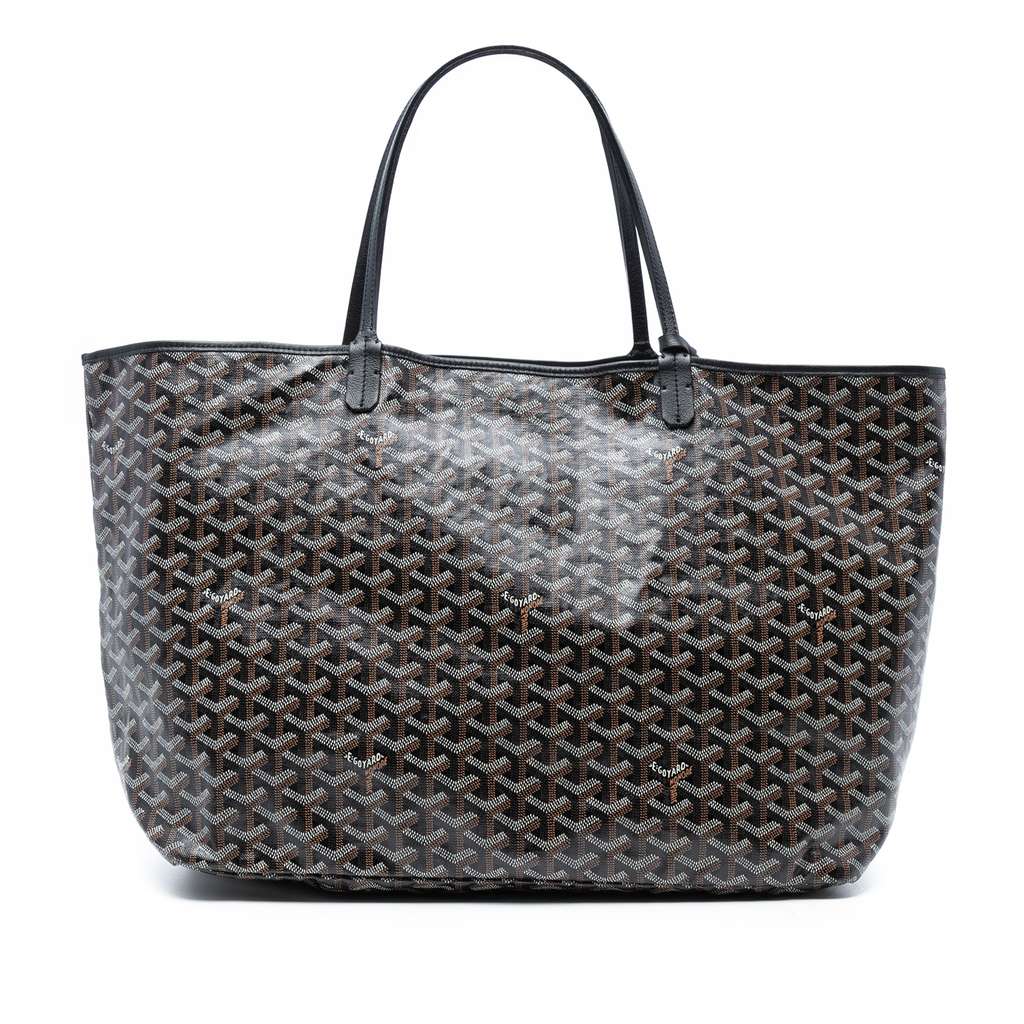 The Saint Louis GM features a coated canvas body with leather trim, flat leather handles, and an open top.