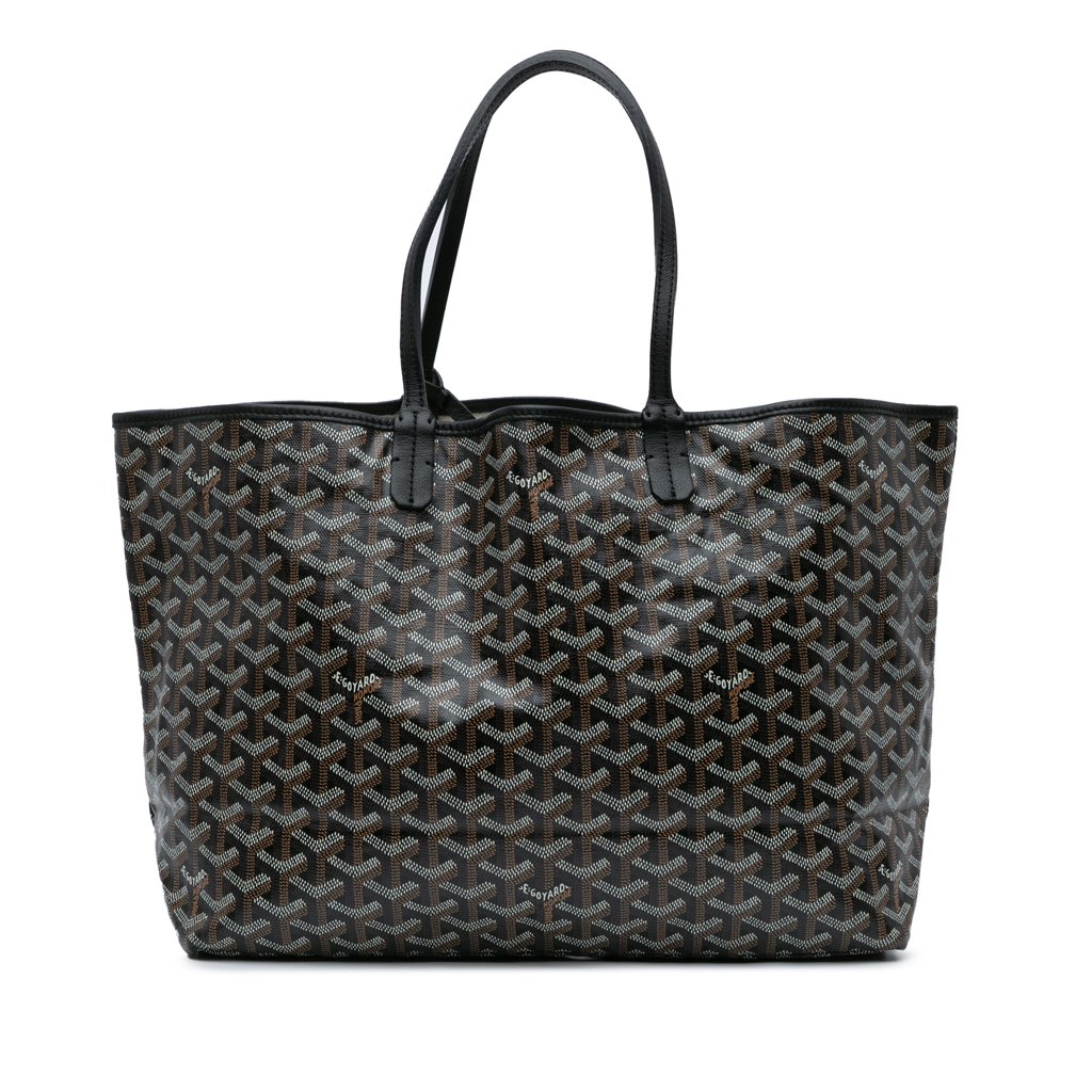The Saint Louis PM features a coated canvas body with leather trim, flat leather handles, and an open top.