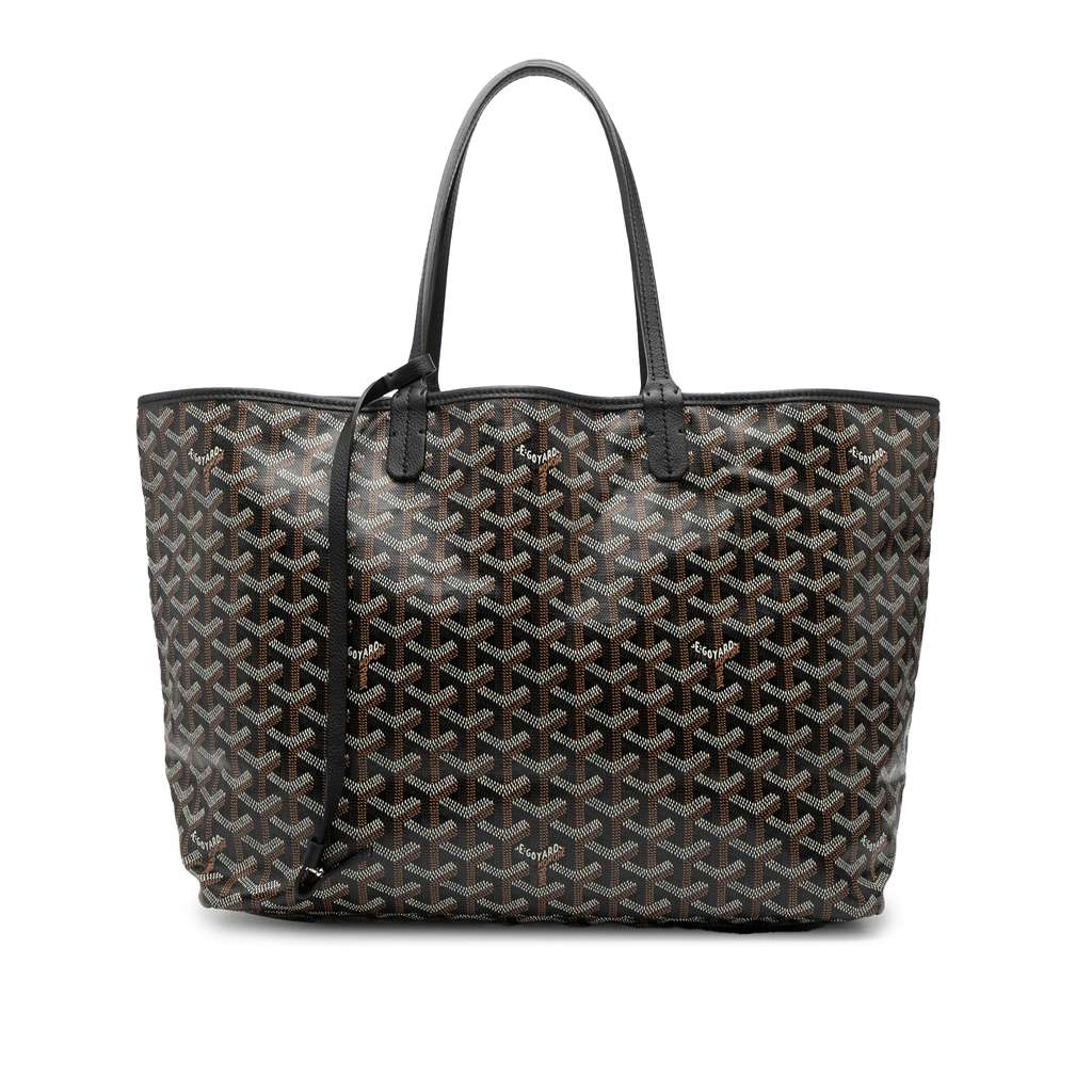 The Saint Louis PM features a coated canvas body with leather trim, flat leather handles, an open top, and a pouch inclusion.